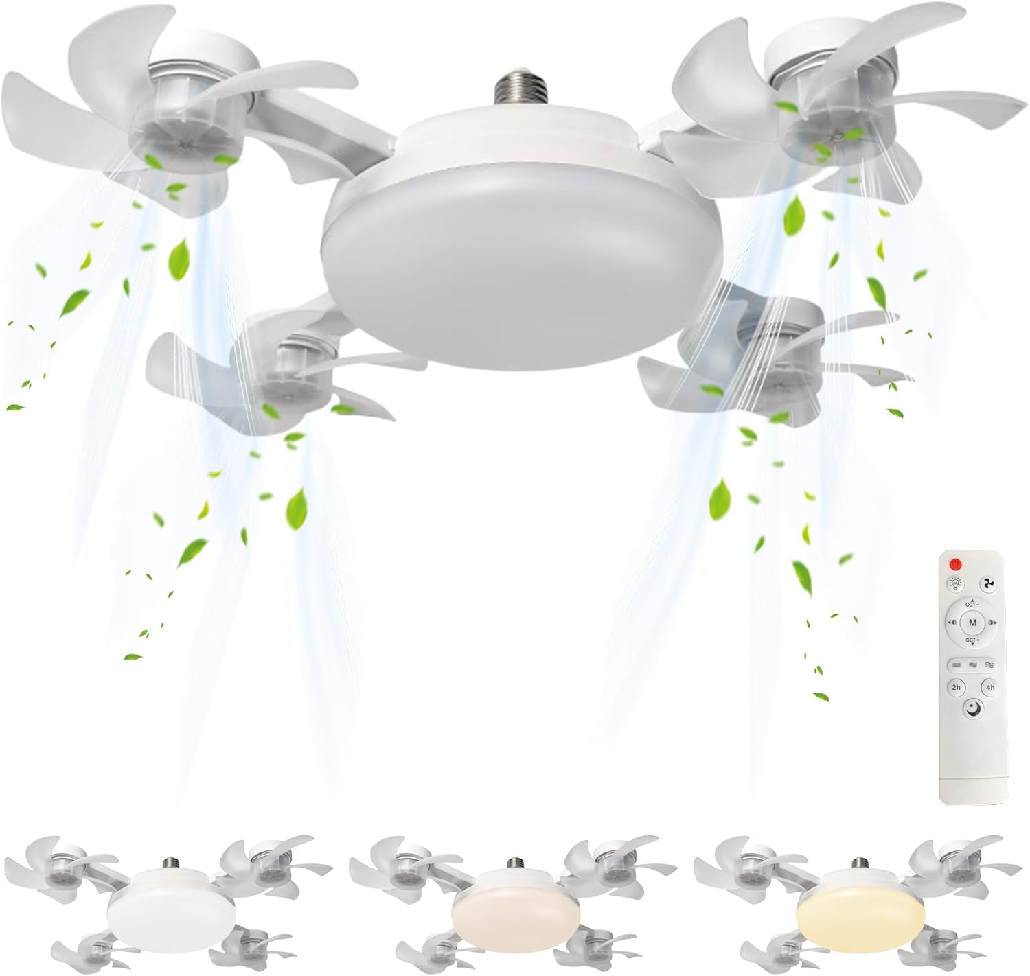 4 Head Drone Fan Lights, E27 Screw in Ceiling Fans, Folding Ceiling Fans with Lights, Light Bulb Fans with Remote, 3 Colors, 3 Speeds, for Bedroom, Living Room, Kitchen, Garage, Gazebo, Small
